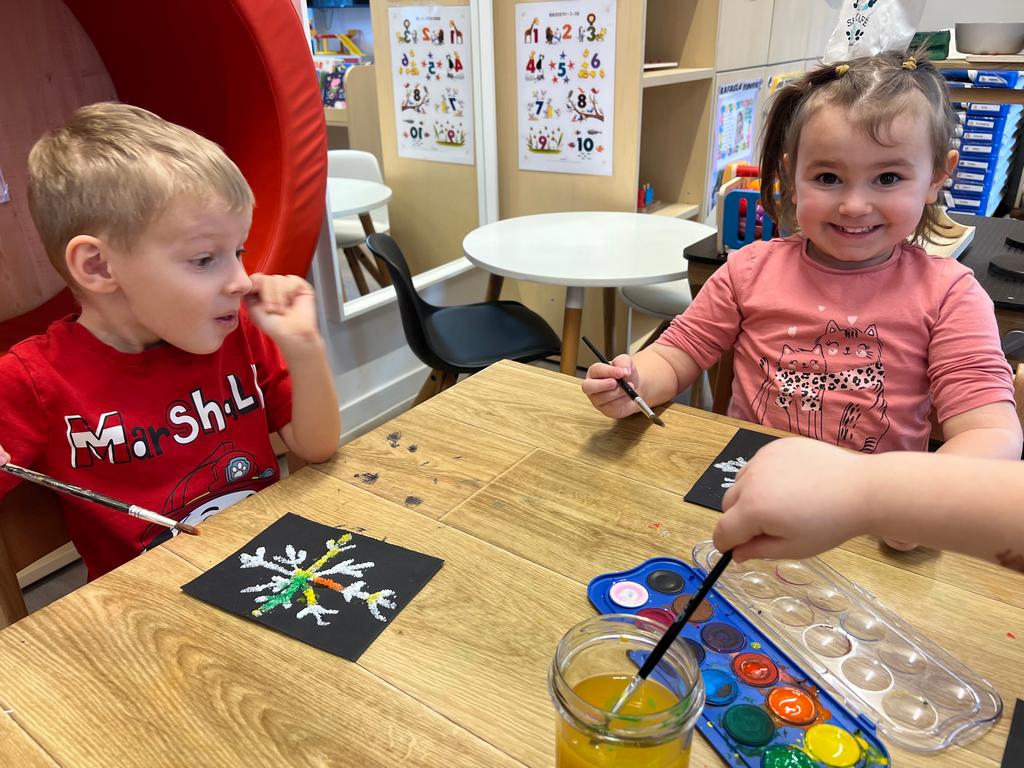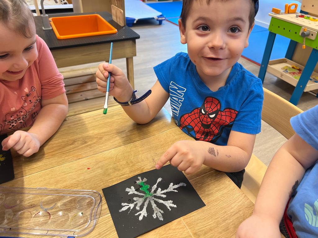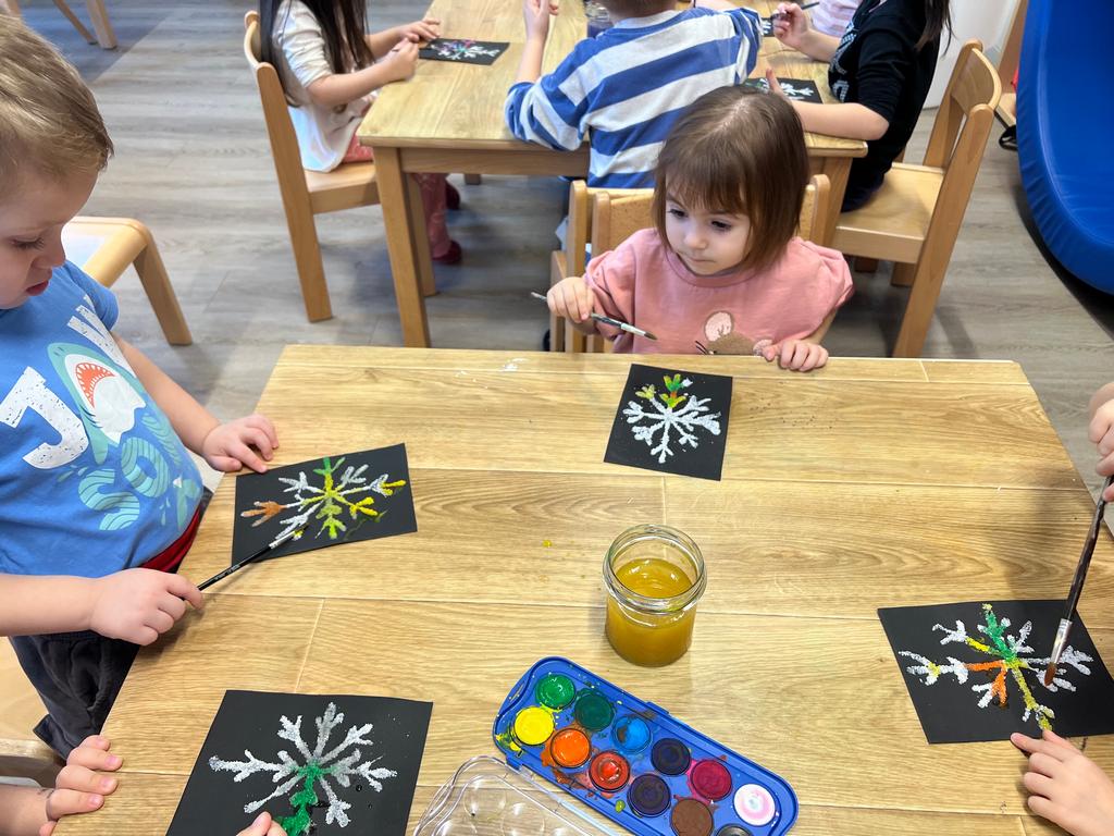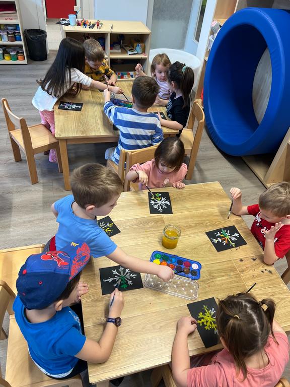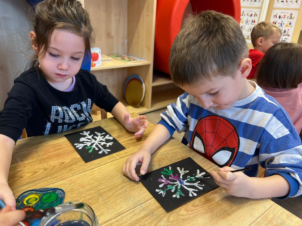 Djeca su sudjelovala u kreativnoj likovnoj aktivnosti u kojoj smo na crni hamer nanosili ljepilo u obliku pahuljice. Dok je ljepilo još bilo svježe, djeca su po njemu posipala sitnu morsku sol, koja se lijepo primila i stvorila zanimljivu reljefnu strukturu. Nakon sušenja, pahuljice smo oslikavali vodenim bojama.